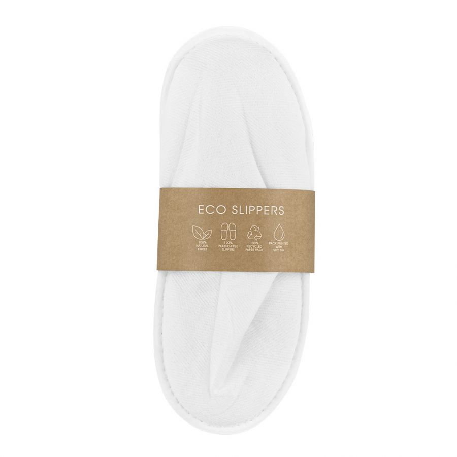 Eco Slippers 100% Plastic-free Closed, 30cm Discover our Eco Slippers, crafted from straw fiber and plant-based viscose. These slippers are 100% plastic free, with recycled paper banderoles printed with 100% soy ink for a more conscious choice.